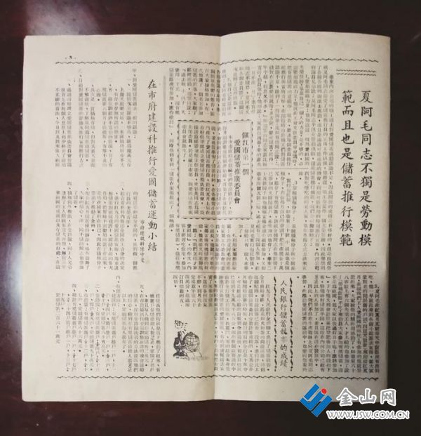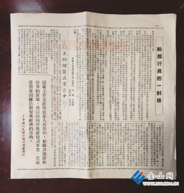 而苏医工会的故事就比较有意思了:马季洪把太太的一块黄金拿出来储蓄;倪斌与太太商议将预备用于子女教育的一两黄金换成储蓄;胡善钧将爸爸妈妈用于养老的96枚银元发起了出来;姜桂芳兑换了两只金镯子,一只别花又存成半年和一年的奖储和定时记者看出,仍是苏医工会的人会过日子,手上一般都有硬通货。宣扬册最终一页还有一篇“劝储蓄”的相声剧本(图5),便利各单位宣扬时运用。